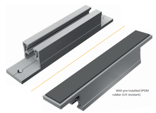 For horizontal module arrangement on the trapezoidal sheet metal roof. Vertical installation is possible using a shim (item no. 91701-00) or by additionally using cross connectors and rails. Pre-assembled EPDM rubber strips (UV-resistant) ensure the necessary tightness when screwing.
