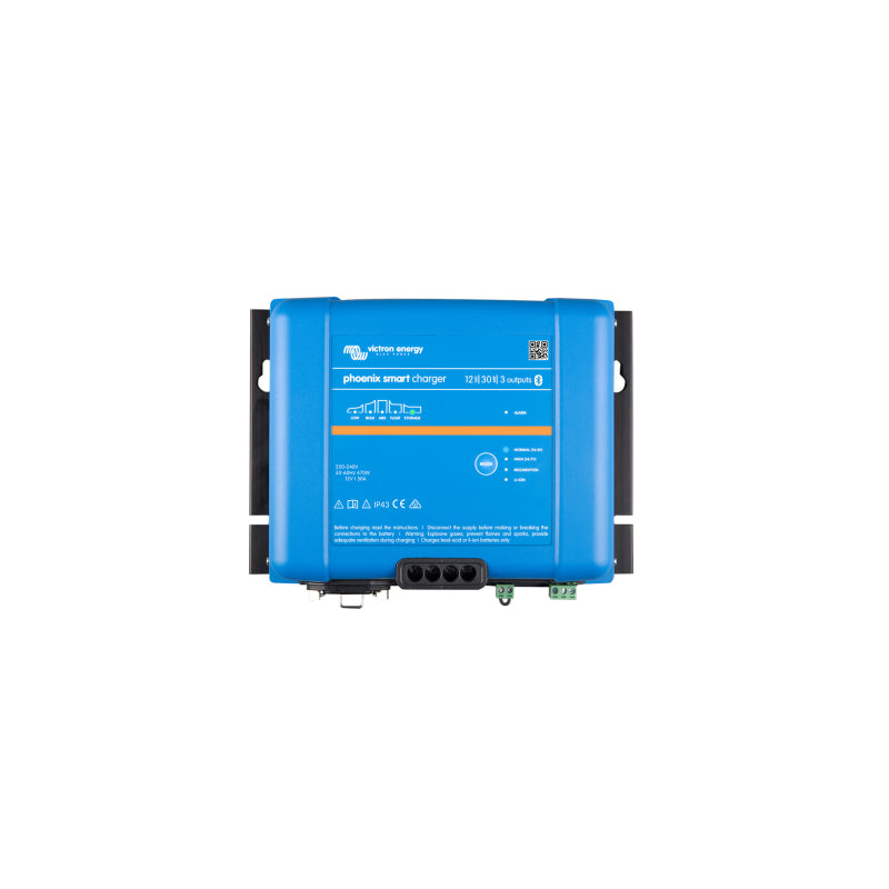 This adaptive 5-step Phoenix Smart Ip43 charger 24/25(3) can provide either 30A or 50A of charge to each of three battery banks. Or the Phoenix 1+1 model provides 3A to the starter-battery, the rest to the ‘house’ bank. 24V models are available with 16A/25A charge. Bluetooth built-in so it can be programmed from your phone or tablet using Victron Connect. Its VE Direct port means you can connect it to a Cerbo GX. Its remote port means you can control it from a BMS. Its relay port means you can control external devices from it (only while connected to AC power). It has a 6 stage charge algorithm with storage mode for conventional batteries and a 3 stage algorithm for Lithium batteries. Its IP rating gives it limited protection from sprayed water.